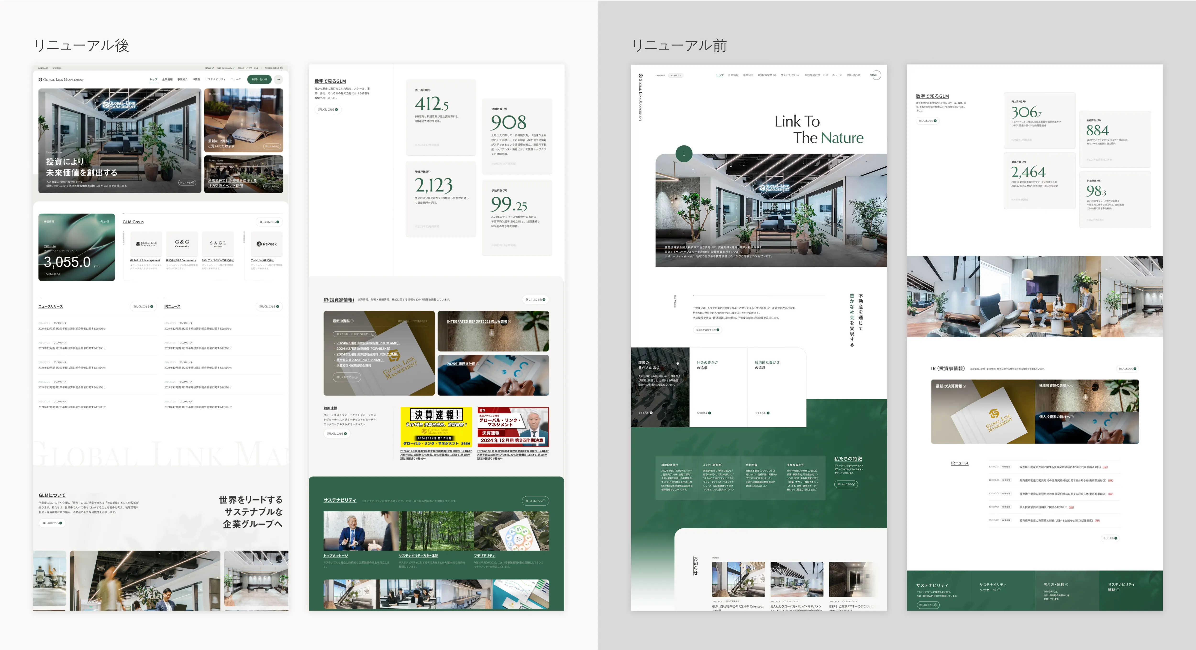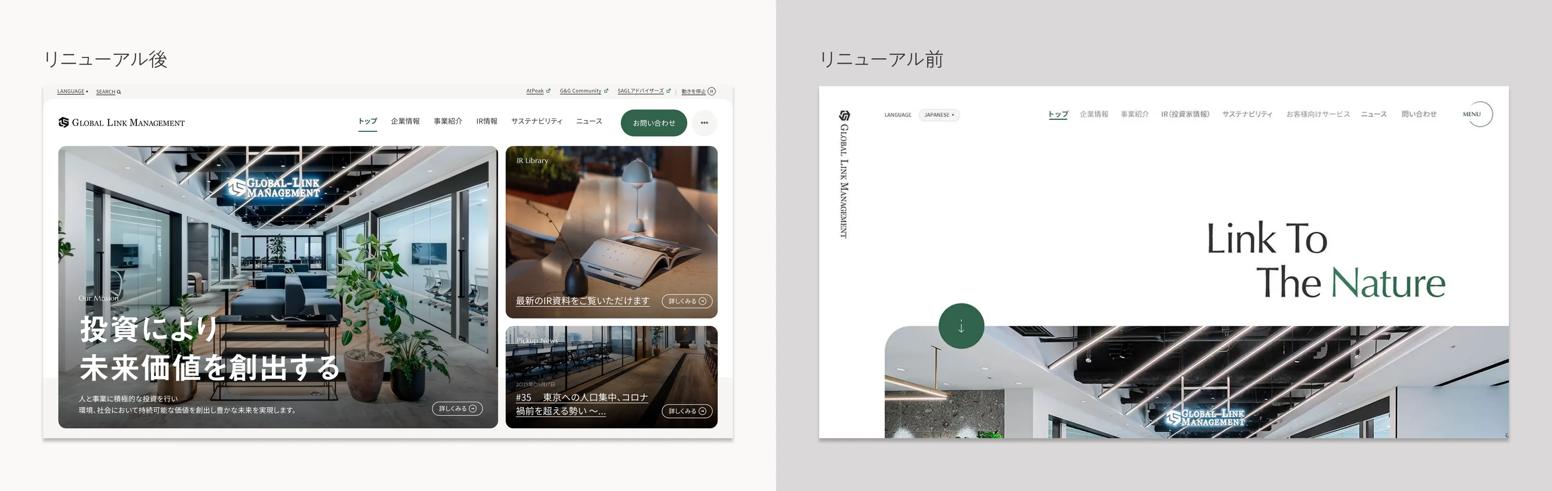 GLM(近藤様): きっかけは、事業の方向性をアップデートしたことと当社の株式時価総額が大きくなったことでしょうか。3年前に作っていただいたサイトは、当社が開発した不動産を個人のお客様に対しても販売していたため、個人向けのコンテンツも多くあったのですが、販売先が機関投資家をはじめとした法人中心になりました。また、3年前の時価総額は60億円前後でしたが、300億円を超えてきたことで、IRコンテンツに多くの方がアクセスしていただけるようになってきました。お客様の層や訪問者数が変わったことで、サイトで伝えるべき内容やアピールポイントを見直す必要性を感じました。そのため、今回の見直し後のサイトはターゲットを企業様や投資家向けのサイトにしています。